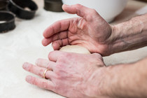 Perfectly seasoned pork filling is put into each pie by hand, before the lid is rolled and fitted by hand. Finally, an egg-wash is applied by hand.