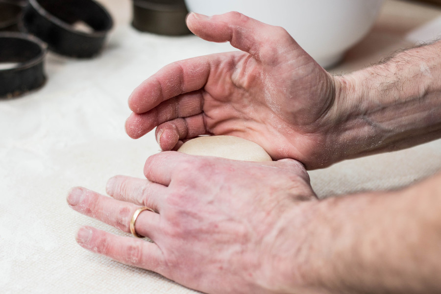 Hot water paste is mixed, kneaded, rolled and shaped by hand.